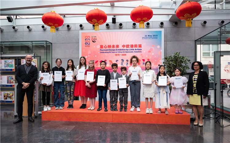 朱京在致辞中表示,在5月6日驻欧盟使团举办的庆祝中欧建交50周年招待会上,孩子们的明信片作品提前亮相,广受好评。青少年儿童是中国与欧盟友谊与合作的未来,期待今后看到中欧未来一代更多交流与往来。