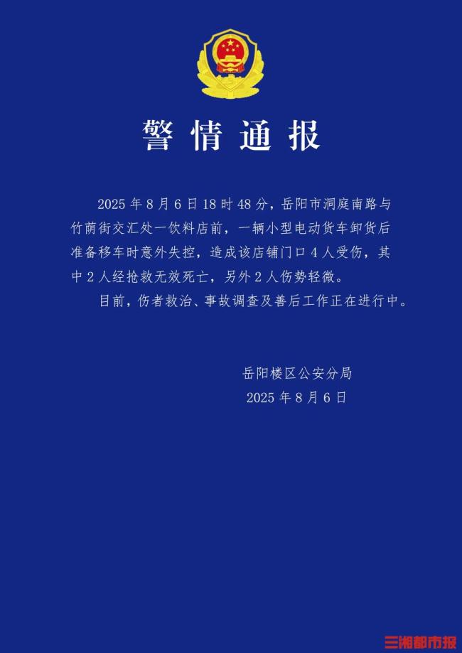 岳阳小型货车冲撞奶茶店2死2伤 事故调查进行中!8月6日,岳阳洞庭南路附近发生一起事故,一辆印有“库迪”商标的小型卡车冲撞进了茶颜悦色门店,并撞倒数名路人。当晚,岳阳楼区公安分局发布警情通报称,当天18时48分,在岳阳市洞庭南路与竹荫街交汇处的一家饮料店前,一辆小型电动货车在卸货后准备移车时意外失控,导致该店铺门口4人受伤,其中2人经抢救无效死亡,另外2人伤势轻微。目前,伤者救治、事故调查及善后工作正在进行中。