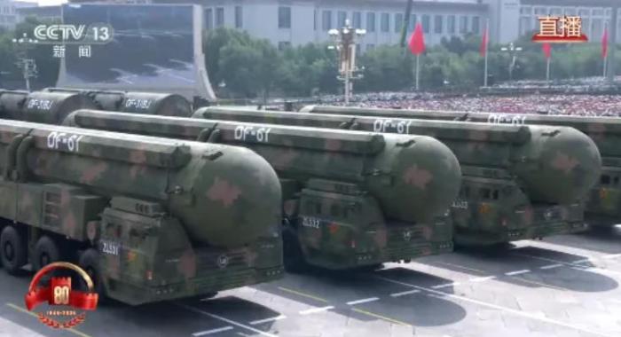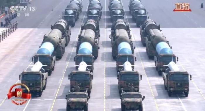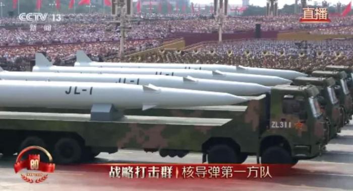 受阅的“惊雷-1”空基远程导弹、“巨浪-3”潜射洲际导弹、“东风-61”陆基洲际导弹、“东风-31”新型陆基洲际导弹,首次集中展示我军陆、海、空基“三位一体”战略核力量,是维护国家主权、捍卫民族尊严的战略“王牌”。