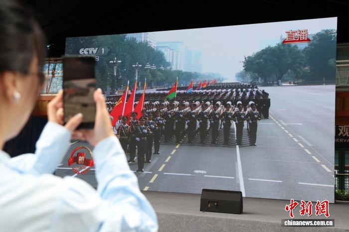 9月3日,市民在上海环球港商厦,通过商厦内的大屏幕观看九三阅兵盛况。中新社记者 汤彦俊 摄