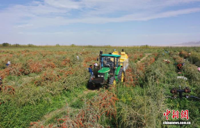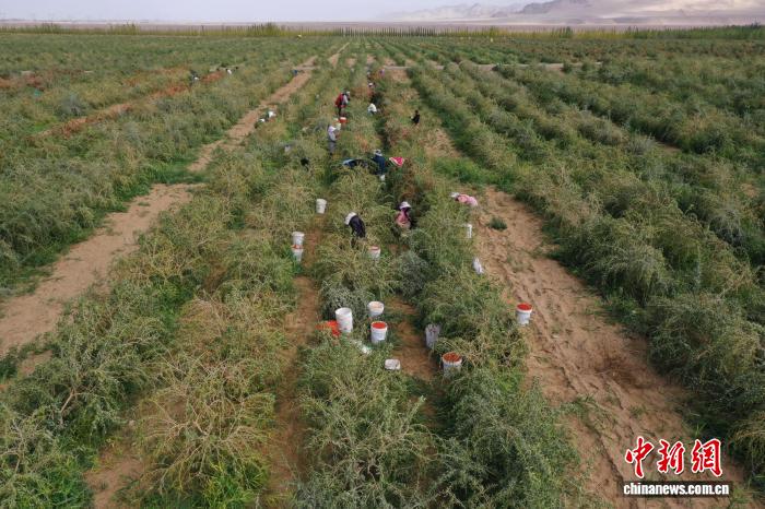 9月4日,青海省海西蒙古族藏族自治州格尔木市种植的柴达木枸杞迎来丰收季。图为工人采摘新鲜的枸杞。(无人机照片)张忠苹 摄