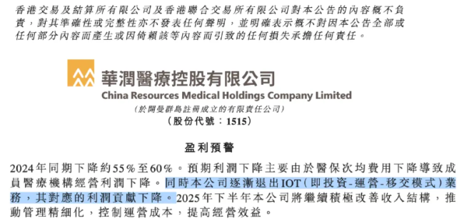 近日,华润医疗发布公告宣布逐步退出IOT(即投资-运营-移交模式)业务。