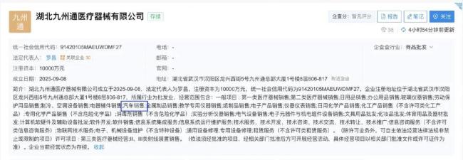 值得注意的是,这并非九州通首次布局含汽车销售业务的新公司。今年3月、7月和8月,九州通先后成立上海九州通金山医疗器械有限公司、武汉市江夏九州通医疗器械有限公司、四川九州通博睿医疗科技有限公司,三家新公司的经营范围均包含汽车销售业务。