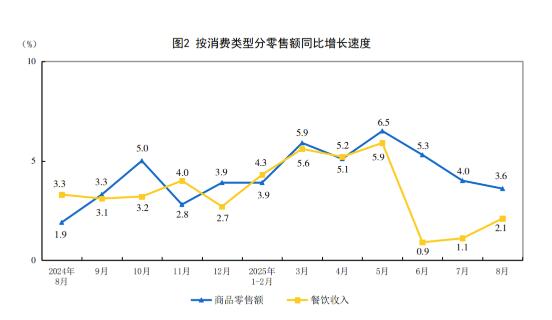 按消费类型分,8月份,商品零售额35172亿元,同比增长3.6%;餐饮收入4496亿元,增长2.1%。1—8月份,商品零售额287426亿元,增长4.8%;餐饮收入36480亿元,增长3.6%。