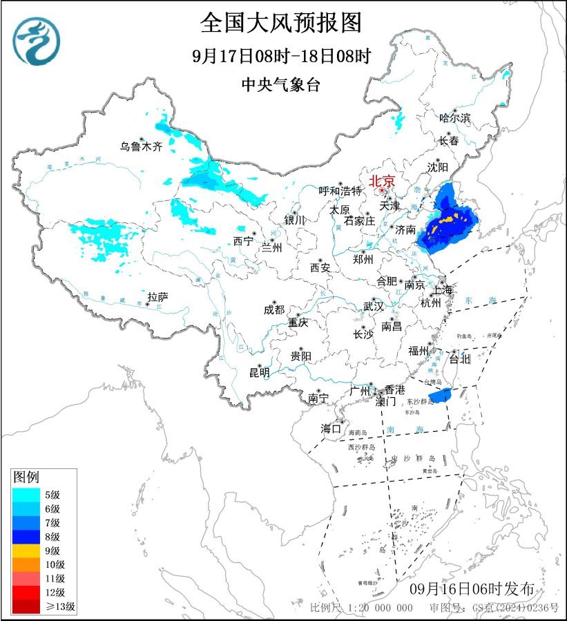 预计,9月16日8时至17日8时,新疆东部及南疆盆地、甘肃河西、青海北部、内蒙古西部和中东部、东北地区西部、山东半岛等地部分地区有5级、阵风7级的大风,其中,内蒙古东北部的部分地区风力可达7级、阵风9级;渤海、渤海海峡、黄海北部和中西部海域将有7~8级、阵风9级的大风,其中黄海中西部的部分海域风力可达9~10级、阵风11级。