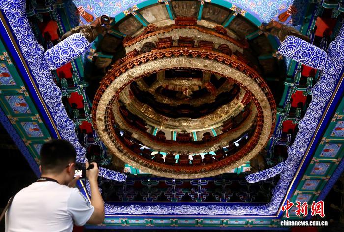 7月27日,为庆祝北京中轴线申遗成功一周年,位于北京中轴线上的北京古代建筑博物馆(先农坛)免费开放一日,供民众参观游览。图为市民拍摄藻井。中新社记者 易海菲 摄