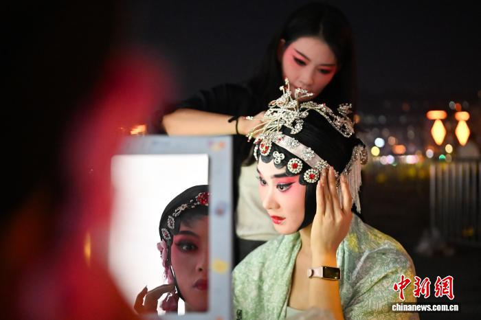 9月18日晚,2025世界大河歌会在长江之畔的重庆市万州区举行。作为2025长江文明论坛重要活动之一,本届大河歌会以“沉浸式互动+国际化表达”为核心,采用开放式舞台设计,将江面游轮、沿岸景观纳入表演空间,来自国内外的知名艺术家通过大型歌舞、川剧、交响乐等形式,展现大河文明的深厚底蕴与时代风采。图为重庆三峡川剧团的演员们在演出前准备妆造。中新社记者 何蓬磊 摄