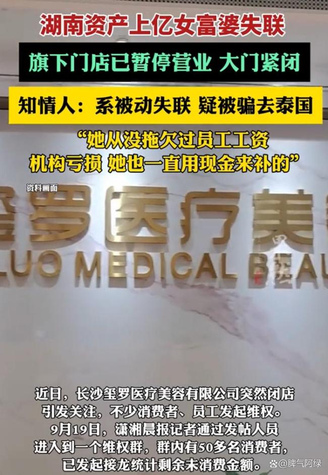 资产上亿女老板失联前称别找自己 背后真相令人震惊。亿万女老板神秘失踪,背后真相让人不寒而栗。就在前几天,湖南长沙一位拥有多家连锁美容院的女老板突然失联了。知情人士透露她可能是被骗去了泰国,而且是被动失联。