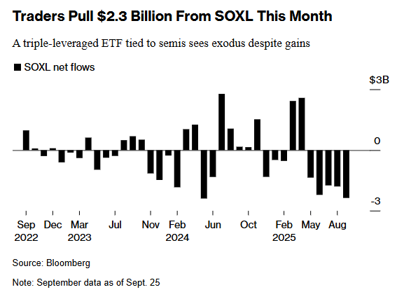 热衷冒险的日内交易者开始从市场最泡沫化的领域撤离,尤其是那些仅凭动能和炒作在夏季飙升的押注。资金正从聚焦前沿技术和高杠杆科技巨头的ETF中撤出,连长期作为风险偏好晴雨表的加密货币也失去了势头。近年来备受散户欢迎的杠杆ETF本月遭遇了约70亿美元的资金流出,创2019年有记录以来最大的单月赎回额。例如,Direxion三倍做多半导体ETF虽然大幅上涨,但投资者仍撤资逾23亿美元。同样,两倍做多特斯拉ETF也在面临史上最大单月资金流出。