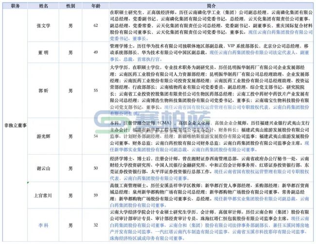 云南白药第十一届董事会成员详情如下: