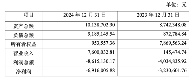 财务数据揭示了诺和欣的经营困境:其业绩持续承压且亏损不断扩大。2023年,该公司净利润亏损323.06万元;2024年亏损幅度进一步加剧至691.60万元,较上年同期亏损规模扩大114%。同期,公司资产总额1013.87万元,负债总额达918.51万元,所有者权益仅余95.36万元,财务状况已显脆弱。