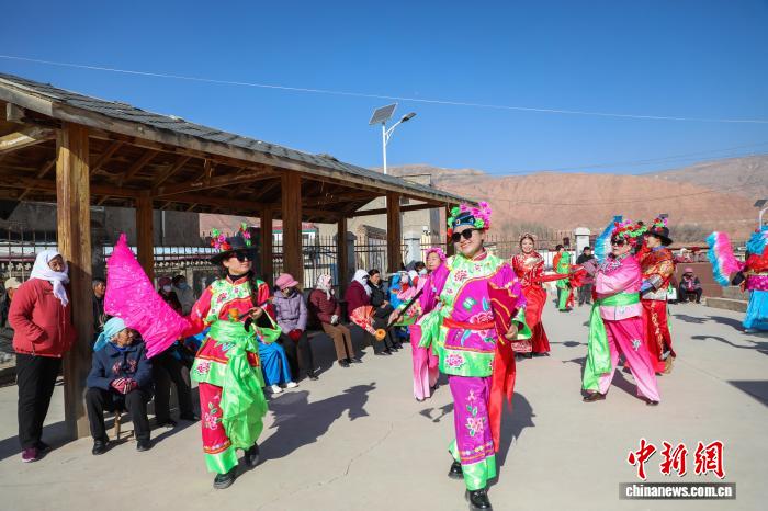 1月22日,青海湟中,民众参与传统社火排练。随着马年春节脚步临近,青海基层组织的文艺表演也进入紧张排练中。中新社记者 马铭言 摄
