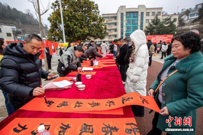 图为2月12日,贵州省黔西市定新彝族苗族乡迎春活动现场,村民在选春联。史开心 摄
