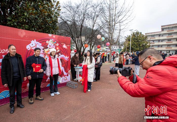 图为2月12日,贵州省黔西市定新彝族苗族乡迎春活动现场,志愿者为村民拍全家福。史开心 摄