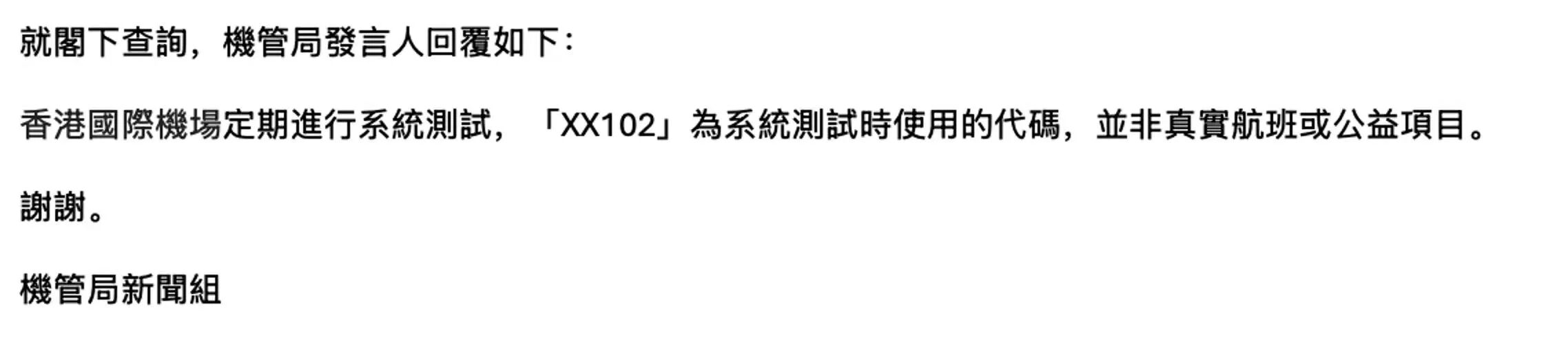 对此,香港机场管理局8日晚在回应中新社记者查询时表示,香港国际机场定期进行系统测试,“XX102”为系统测试时使用的代码,并非真实航班或公益项目。香港国泰航空亦回应称该航班并不属于国泰航空。