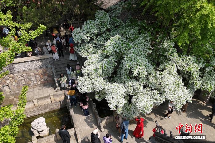 4月15日,泰山王母池百年流苏古树迎来盛花期,吸引游客“打卡” 。陈阳 摄