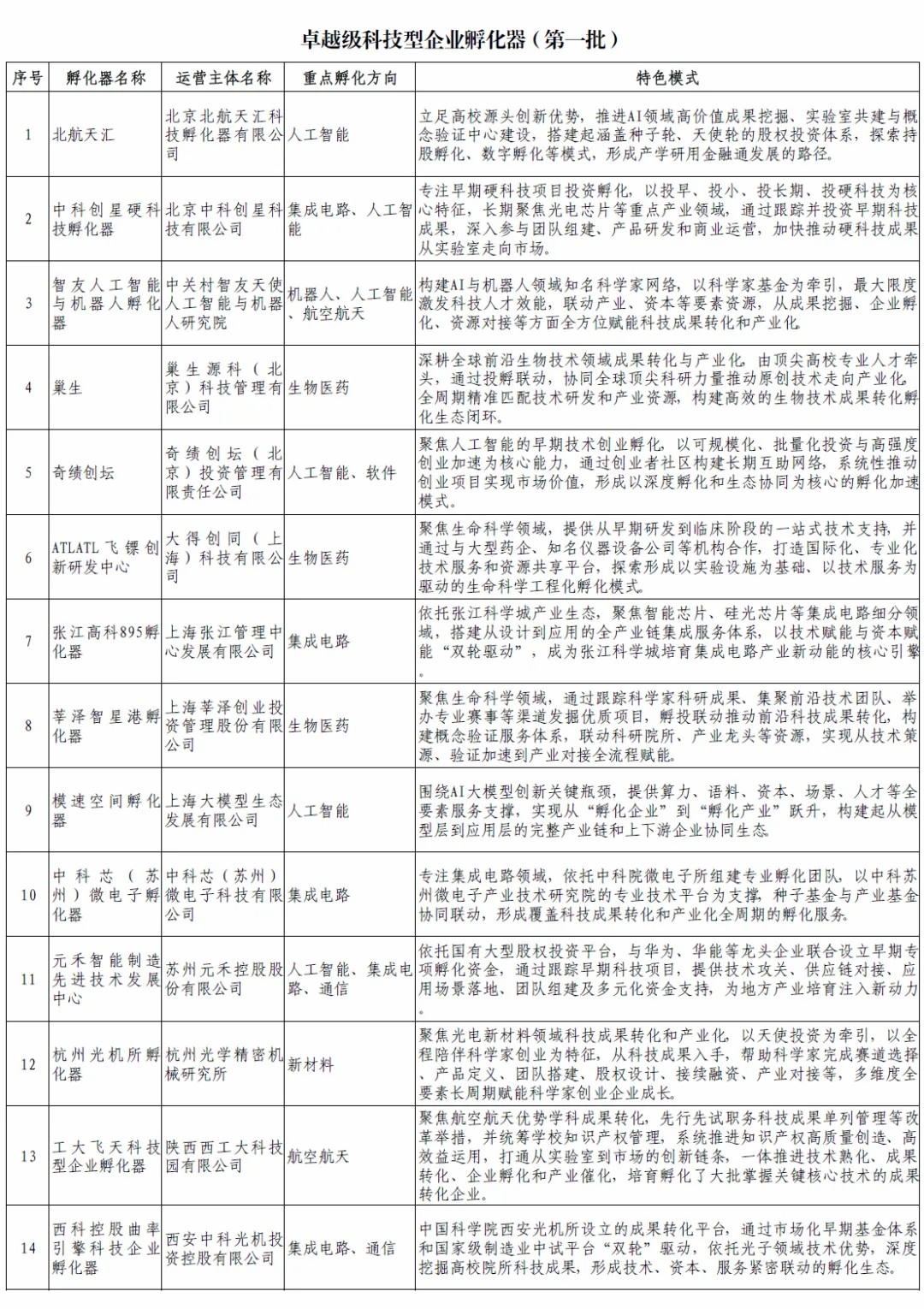 卓越级孵化器:对标国际,打造标杆。首批14家孵化器入选,突出“强产业属性、强服务功能、强人才牵引、强投资赋能、强加速效应”特征,在高校科技成果孵化、前沿技术孵化、投资孵化、产业孵化等方面具有鲜明特色和显著优势,旨在对标国际一流,打造引领科技创新和产业创新融合的标杆载体,为全国孵化器发展提供引领示范。