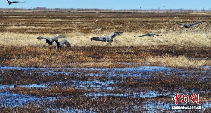 中新网黑河4月17日电 (王琳 姚爱群)阳春三月,160余只国家一级保护野生动物白头鹤迁徙抵达黑龙江省黑河市逊克县,在奇克镇团结村周边湿地停歇觅食、嬉戏飞舞,构成一幅人与自然和谐共生的生态美景。