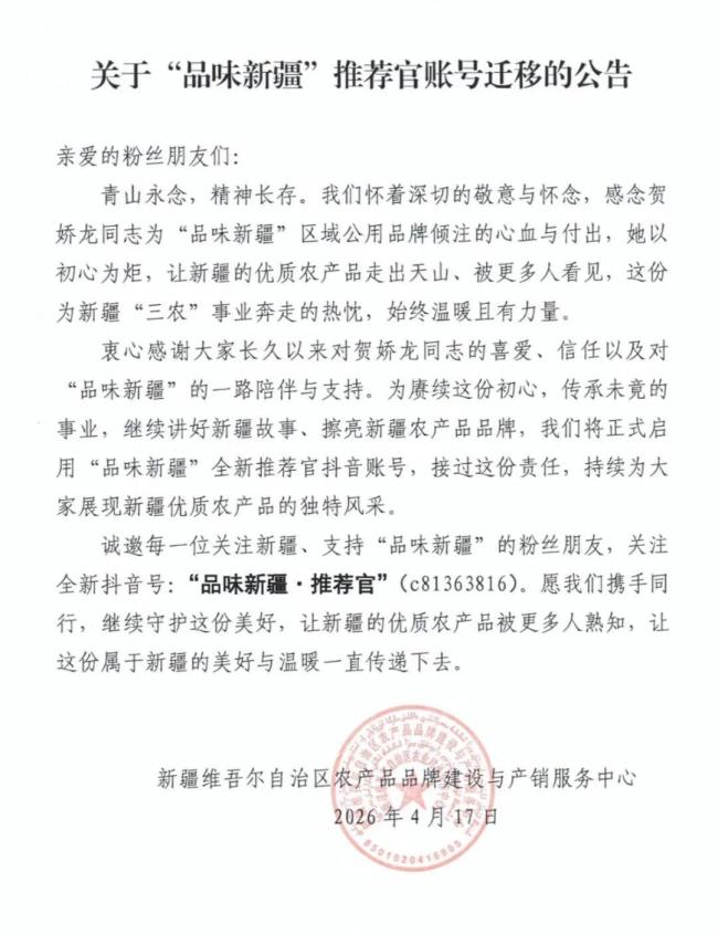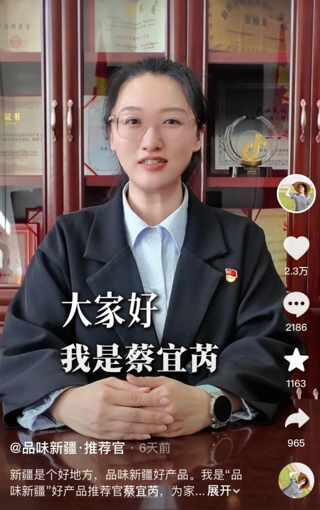 接棒贺娇龙后,清华毕业生发声 专注新疆农特产推广。蔡宜芮来自新疆维吾尔自治区农业农村厅,她在“品味新疆·推荐官”账号上发布了一条视频,介绍自己将陪伴大家认识真正的新疆地道农特产。这条视频于4月14日发布,但起初并未引起太多关注。直到4月19日,“贺娇龙 品味新疆”账号发布了一份公告,解释了贺娇龙账号及新开通账号的情况,这才让更多人注意到“品味新疆·推荐官”账号和蔡宜芮。
