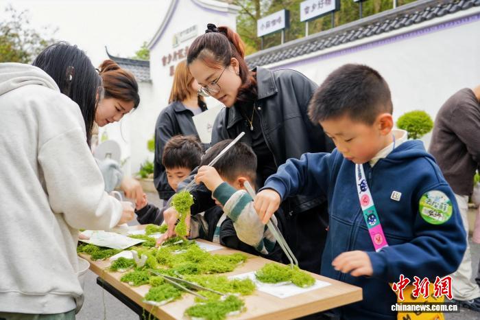 小朋友在家长陪同下接触苔藓微景观。莲都区委组织部供图