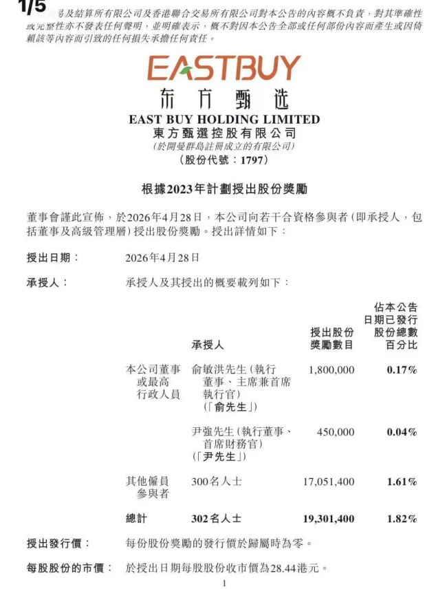 东方甄选(01797.HK)4月28日晚间发布公告,依据2023年股份激励计划,向公司董事、高管及核心员工授出1930.14万股股份奖励,涉及302人,占已发行股份1.82%,当日收盘价28.44港元/股。