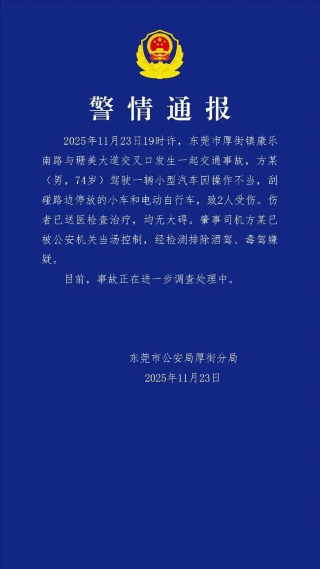 11月23日晚,广东省东莞市公安局厚街分局通报了一起交通事故。当天19时许,在东莞市厚街镇康乐南路与珊美大道交叉口,一名74岁的男性驾驶员方某因操作不当,导致其驾驶的小型汽车刮碰了路边停放的几辆小车和电动自行车,事故造成两人受伤