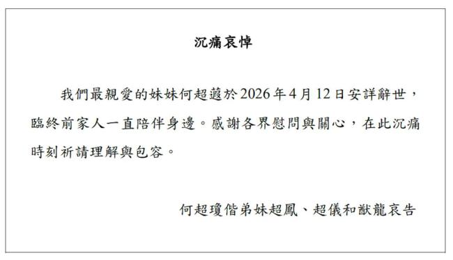 4月12日,“赌王”何鸿燊的女儿、信德集团执行董事何超蕸逝世,享年60岁。信德集团当日发布哀悼声明,并附上家人通告:“我们最亲爱的妹妹何超蕸于2026年4月12日安详辞世,临终前家人一直陪伴身边