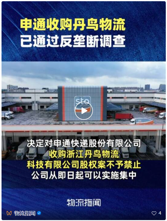 申通快递:收购丹鸟物流事项通过反垄断审查