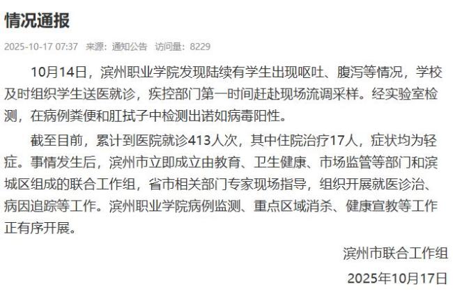官方通报滨州多名学生呕吐腹泻 诺如病毒阳性确诊