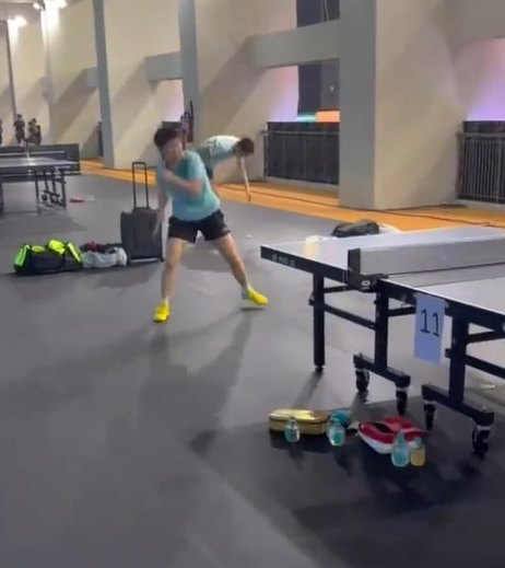 孙颖莎训练后蹲地吃泡面!
