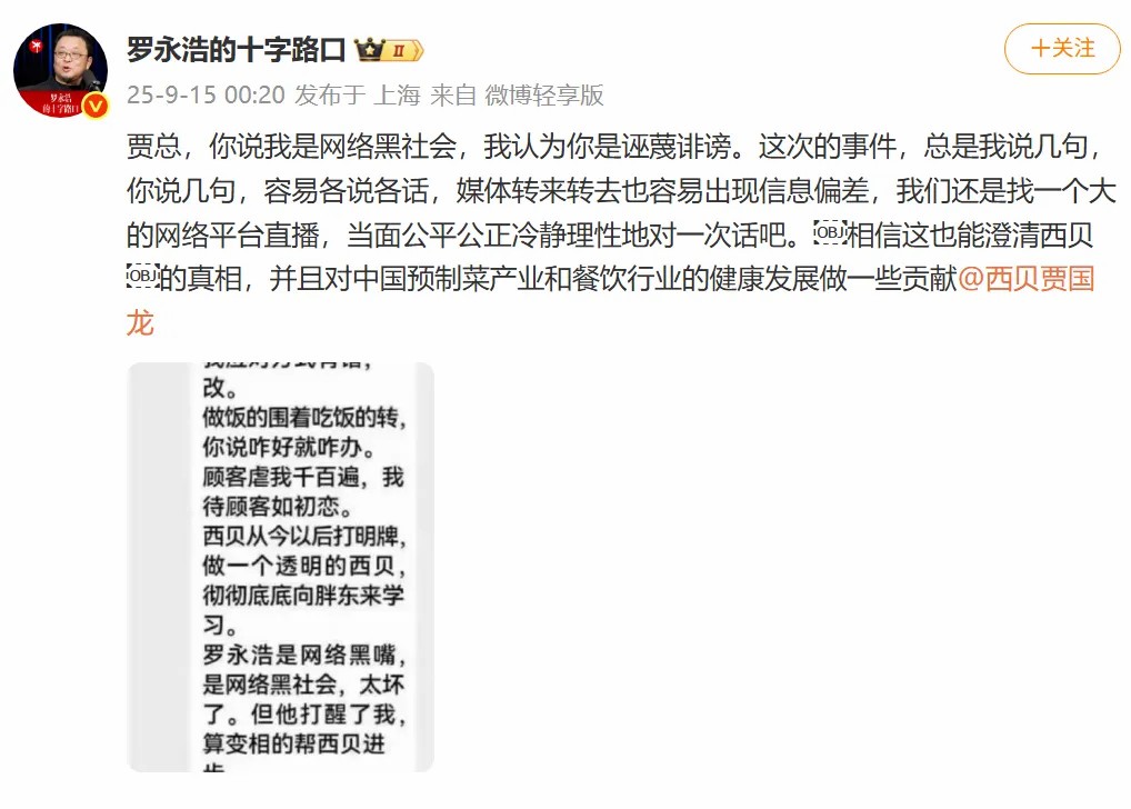 在西贝创始人贾国龙道歉的截图流传出后,罗永浩15日凌晨发文回应称: 贾总,你说我是网络黑社会,我认为你是诬蔑诽谤。这次的事件,总是我说几句,你说几句,容易各说各话,媒体转来转去也容易出现信息偏差,我们还是