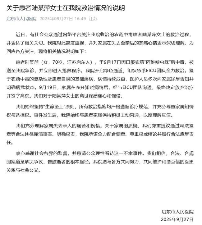 9月27日,江苏启东市人民医院发布了关于患者陆某萍女士的救治情况说明。近日,有社会公众通过网络平台关注该院收治的农药中毒患者陆某萍女士的救治过程,并表达了相关关切。医院对此高度重视,并对家属失去至亲后的悲痛心情表示深切理解