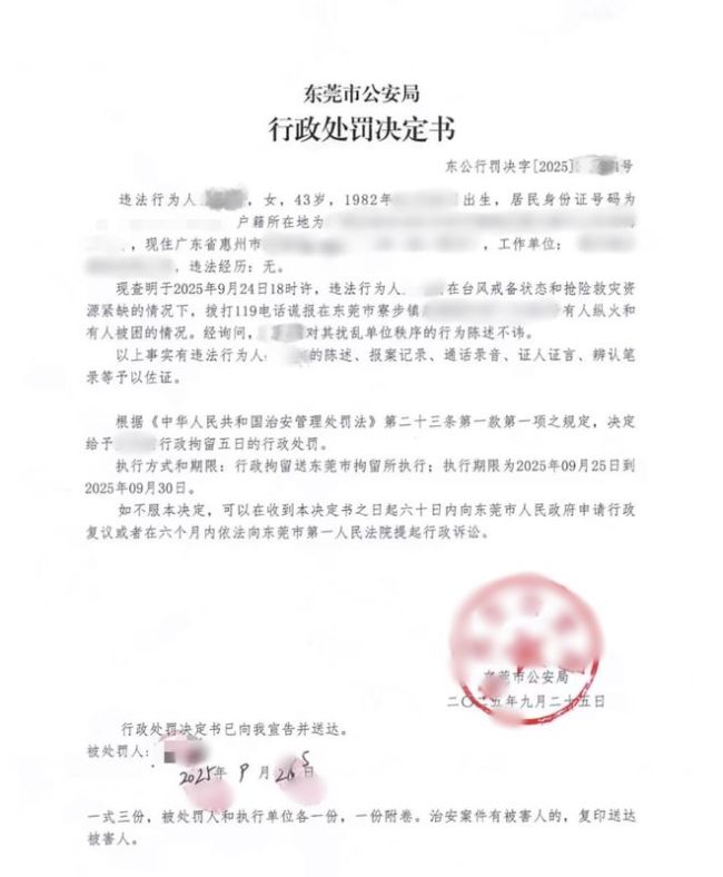 近日,东莞消防披露了一起虚假警情事件。9月24日,台风“桦加沙”来袭,全城进入紧张备战状态。当天18时51分,寮步镇消防大队接到紧急报警,一女子称泉塘围仔西十五巷9号发生纵火并有人被困