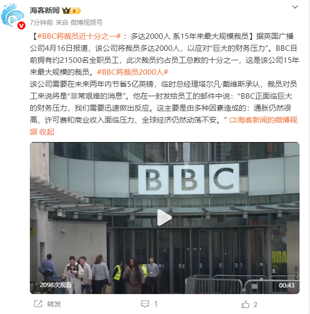 英国广播公司宣布将裁员多达2000人,以应对财务压力。目前BBC拥有约21500名全职员工,此次裁员约占员工总数的十分之一,是该公司15年来最大规模的一次