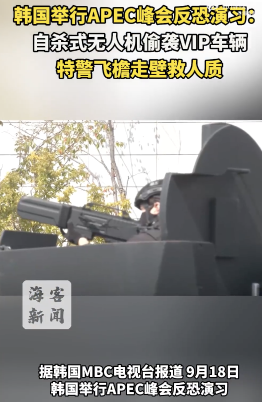 韩国APEC峰会反恐演习画面曝光。韩国举行APEC峰会反恐演习:自杀式无人机偷袭VIP车辆特警飞檐走壁救人质。据韩国MBC电视台报道,9月18日,韩国举行APEC峰会反恐演习,演练内容包括应对自杀式无人机袭击和毒气攻击、恐怖分子清剿、人质解...