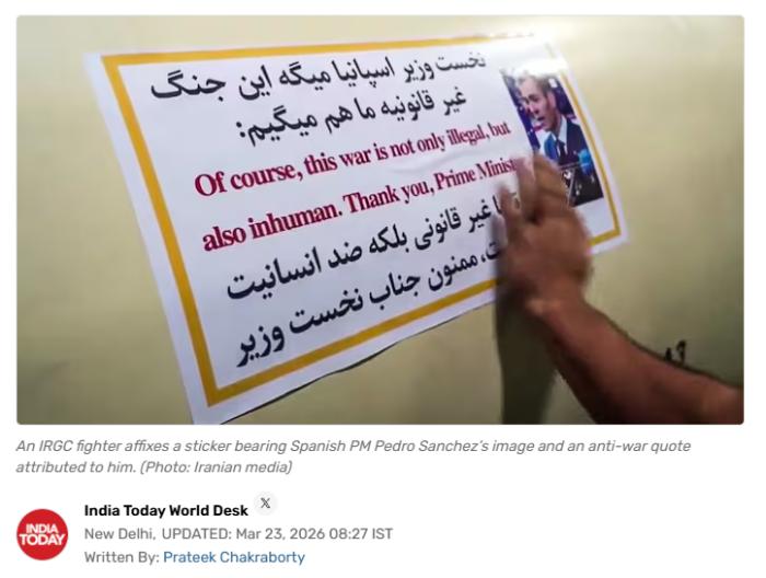 中新网3月23日电 据《印度时报》、《今日印度》23日援引伊朗当地媒体报道,伊朗将西班牙首相桑切斯的言论以英语和波斯语两种语言写在贴纸上,并贴在从伊朗向以色列发射的导弹上。