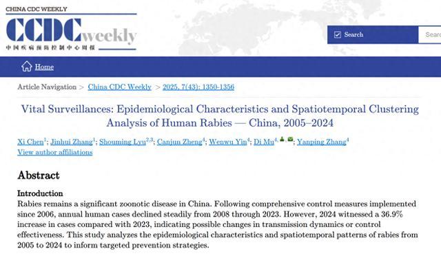 10月24日,《中国疾病预防控制中心英文周报》发布了一项关于中国狂犬病病例数的流行病学和时空聚类分析报告。报告显示,自2006年实施狂犬病综合防控措施后,我国狂犬病病例数在2007年达到3300例的高峰后,进入了长达16年的下降趋势