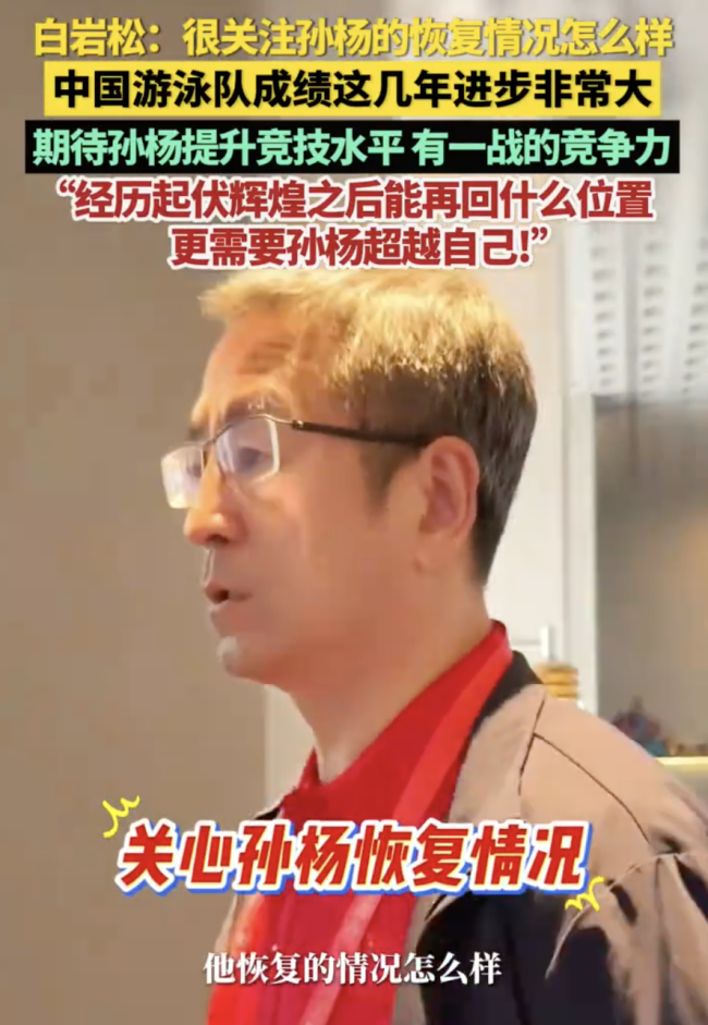 白岩松期待孙杨超越自己。11月12日,广东深圳。中国蓝新闻记者采访白岩松,他表示很关注浙江运动员孙杨。孙杨的恢复情况怎么样,这一切都是以训练为基础。中国游泳队成绩这几年进步非常大,期待孙杨提升竞技水平,能有一战的竞争力!“很期待经历起伏辉煌...